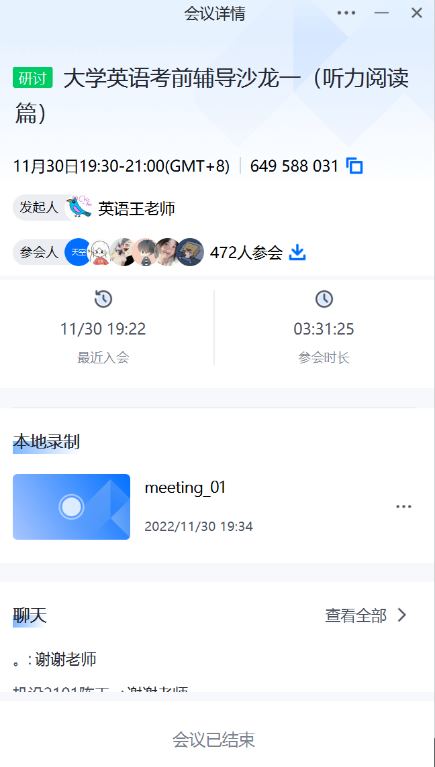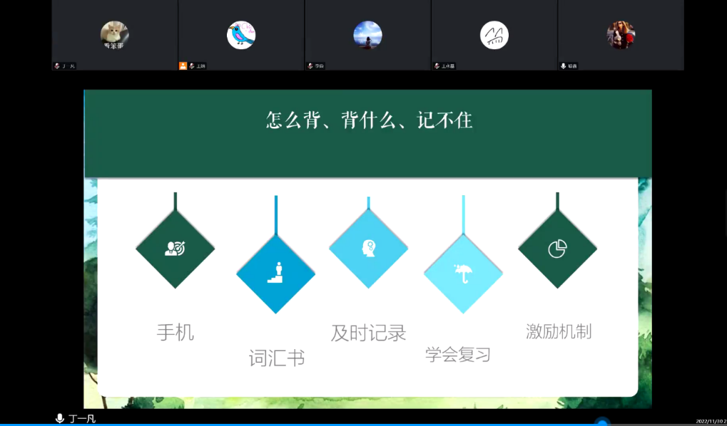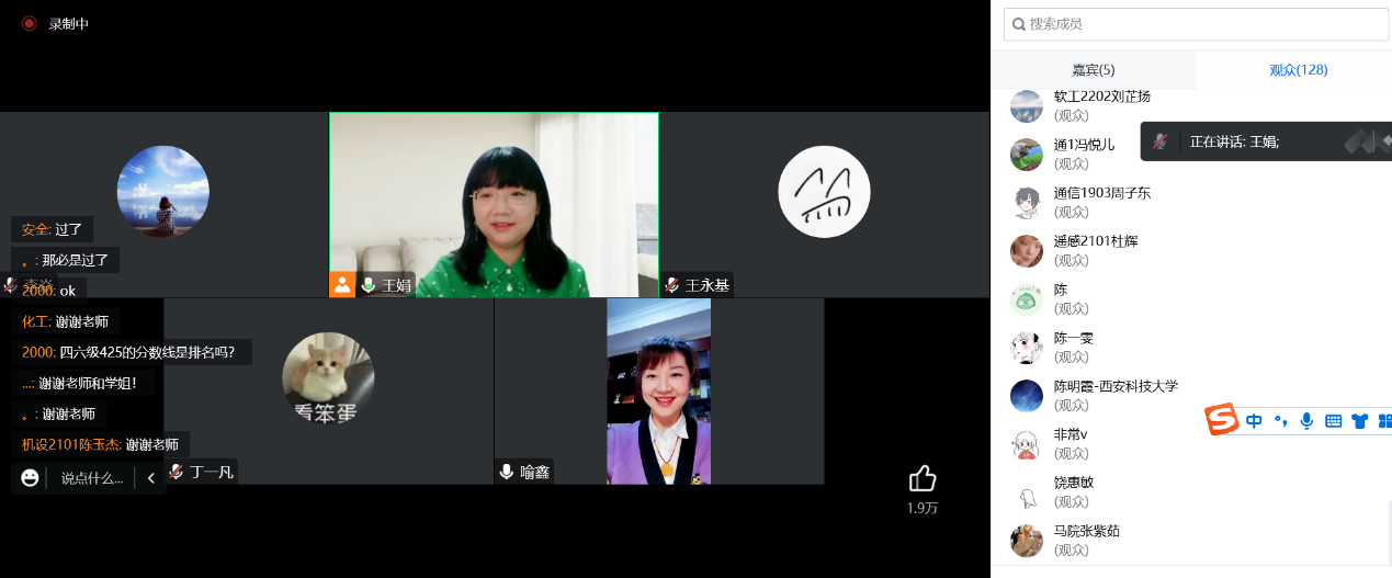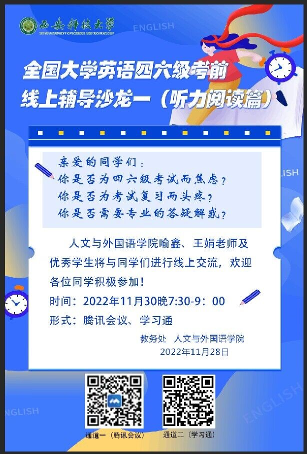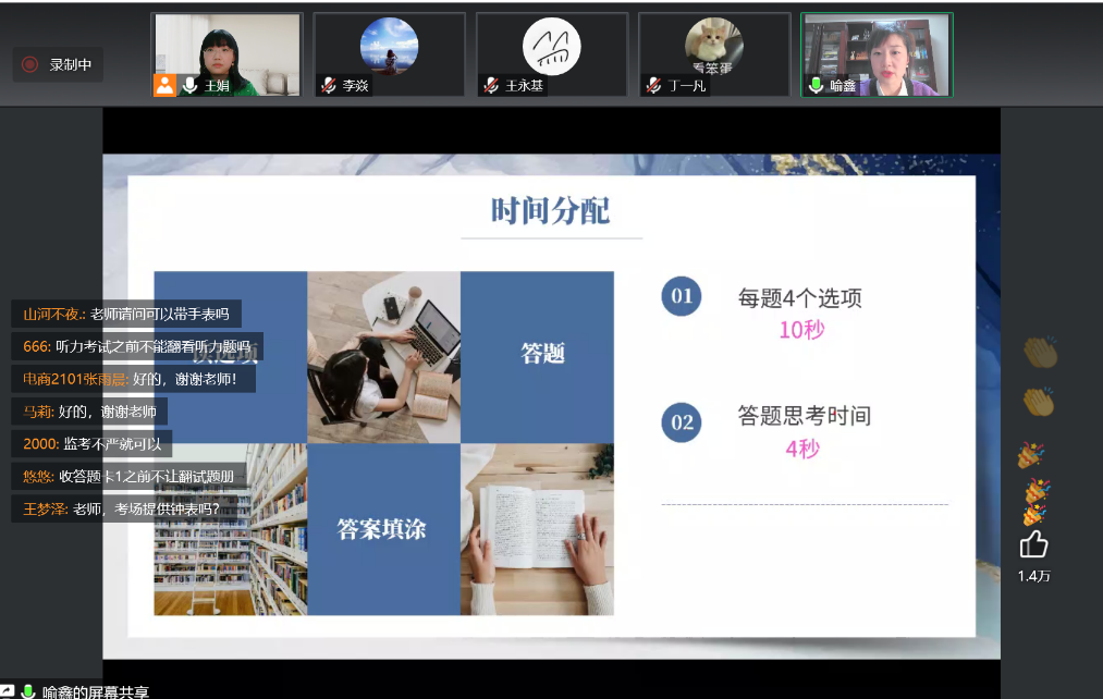 2022年11月30日19:30-21:30,人外学院大学英语四六级辅导沙龙第一期(听力阅读篇)在腾讯会议与超星学习通开播。第一期沙龙由王娟老师主持,喻鑫老师讲解了大学英语四六级听力备考方法,王娟老师分析了阅读题的题型考点、应对方法、备考规划;法学2001班丁一凡同学分享了自己的备考经验。据悉,此次活动由教务处与人外学院联合举办,人外学院副院长李焱老师组织策划,大英二部王娟老师与大英一喻鑫老师具体实施,旨在希望通过系列沙龙活动的开展,丰富beat365官网学生英语学习方式,提升英语素养。