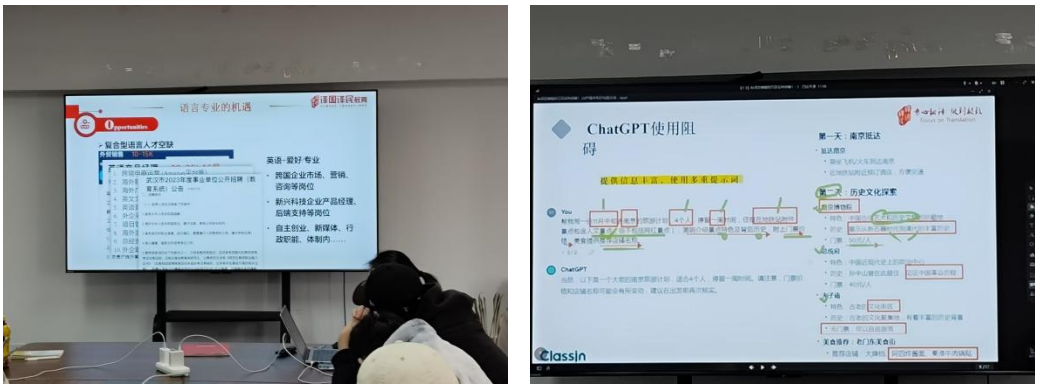 下午,实习生们进入了岗前培训环节,培训内容紧扣行业最新发展动态,尤其是在人工智能时代下,AI工具在语言服务领域的应用。培训的核心部分是对ChatGPT等人工智能技术在翻译及语言服务中的应用进行了详细讲解。学生们了解了如何利用AI工具提高翻译效率,如何通过机器翻译与人工编辑相结合的方式,提升语言服务的质量与准确性。通过实际操作和案例分析,同学们亲身体验了AI工具在日常工作中的广泛应用,认识到技术的不断进步对语言服务行业带来的深远影响。