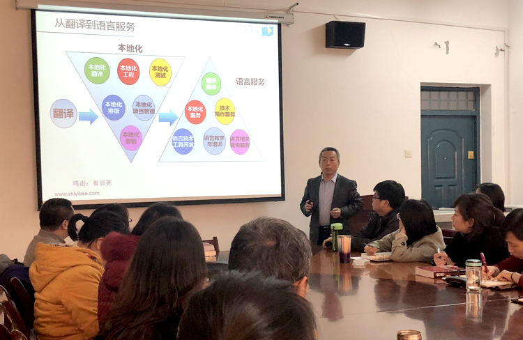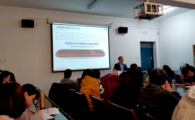 12月10日下午,beat365官方网站在学院会议室举办新时代翻译教育及人才培养专题学术讲座。语言服务行业专家、试译宝总经理师建胜应邀以《人工智能时代的翻译教育与翻译人才能力培养》和《人工智能如何助力翻译教学和科研》为题,介绍了语言服务行业的最新发展趋势,分析了人工智能技术对翻译教育的冲击,探讨了新技术背景下翻译人才综合素质的养成,并对翻译专业学生提出了发展建议。结合翻译的教学与研究,师建胜讲解了人工智能的基本原理和人机结合模式及其应用场景,讨论了如何将人工智能应用于翻译教学和科研中,并回答了师生的提问。报告会由人外学院院长师新民主持,学院英语教师代表和2019MTI研究生聆听了报告。
