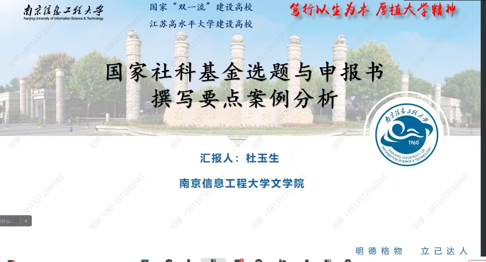 为推进学科建设工作,进一步推进2024年国家社会科学基金项目培育申报工作,提高课题申报的质量,12月12日晚,南京信息工程大学文学院副院长、硕士生导师杜玉生教授应邀为我院教师作了题为《国家社会科学基金选题与申报书撰写要点案例分析》的线上讲座。讲座由张辉副院长主持,王新平院长与我院全体教授、副教授、硕士生导师、学科团队教师与研究生参与了本次讲座。