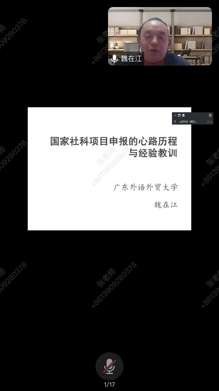 在2024年国家社会科学基金项目申报的关键时段,2月28日晚,beat365官方网站邀请广东外语外贸大学“云山杰出学者”、英语语言文化学院博导魏在江教授给我院教师开展了线上讲座:《国家社会科学项目申报的心路历程与经验教训》。本场讲座由我院副院长张辉主持,院长王新平致辞欢迎并总结发言,学院全体教授、副教授、硕士生导师、学科团队教师与研究生参加。