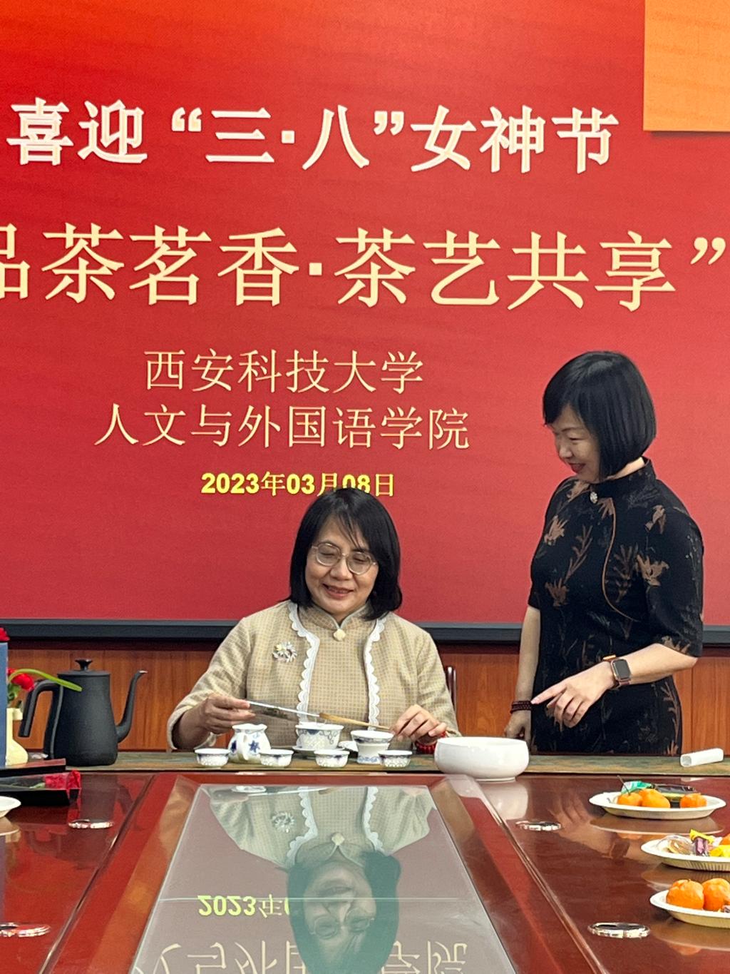 草木蔓发,春山可望!2023年3月8日下午两点,beat365官方网站在骊山校区二号楼226会议室举办了主题为“品茶铭香,茶艺共享”的“三八节”庆祝活动。主题活动在学院工会主席邹虹老师的简短致辞下拉开帷幕。活动邀请了专业茶艺师团队,从茶的分类、起源、冲泡方法以及茶礼等方面为大家作了生动有趣的讲解。学院近三十名教师参加了此次活动,一些教师甚至利用课间休息时间前来参与、聆听讲解。在活动现场,老师们亲自动手温杯、洗茶、泡茶、闻香、奉茶,体会“嫩芽香且灵,吾谓草中央”的传统茶艺之美,在品茗鉴赏中品味“啜苦咽甘,香索心目明”的生活艺术。