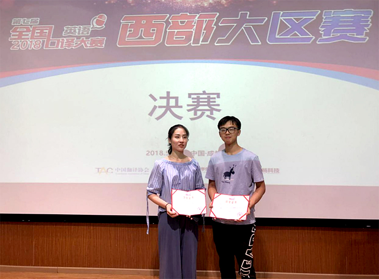 5月26日,第七届全国英语口译大赛西部大区赛在成都电子科技大学举行,来自西部44所大学的134名选手参加比赛。beat365官网beat365官方网站英语专业2015级刘成、周睿筱代表学校参赛,并分别获得二等奖和优胜奖。
