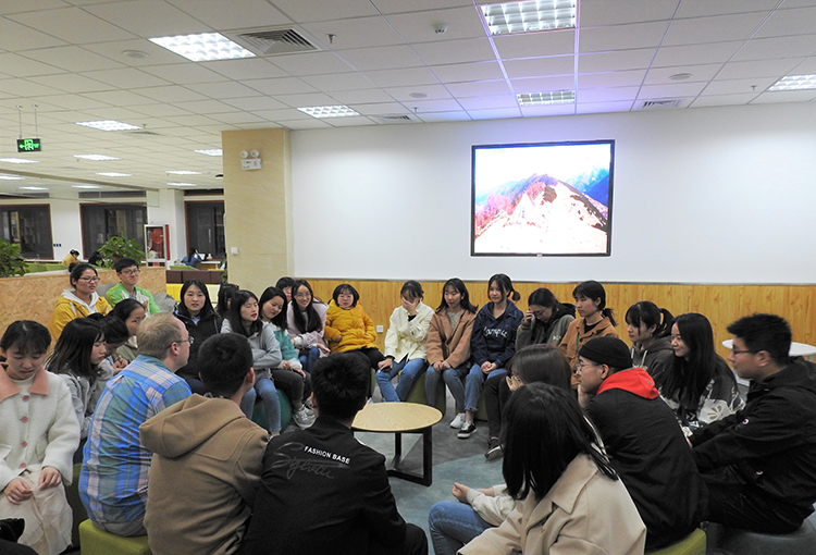 阳春三月,春意渐浓。3月15日晚7点整,beat365官方网站新学期第一次“英语角”活动在临潼校区骊山校园图书馆一层创客空间正式启动。本次活动由英语1601班主办,班级全体成员及部分英语爱好者参与活动。外教James与同学们环坐详谈,对同学们感兴趣的留学、工作、国际问题等话题一一展开,进行了认真的分析。