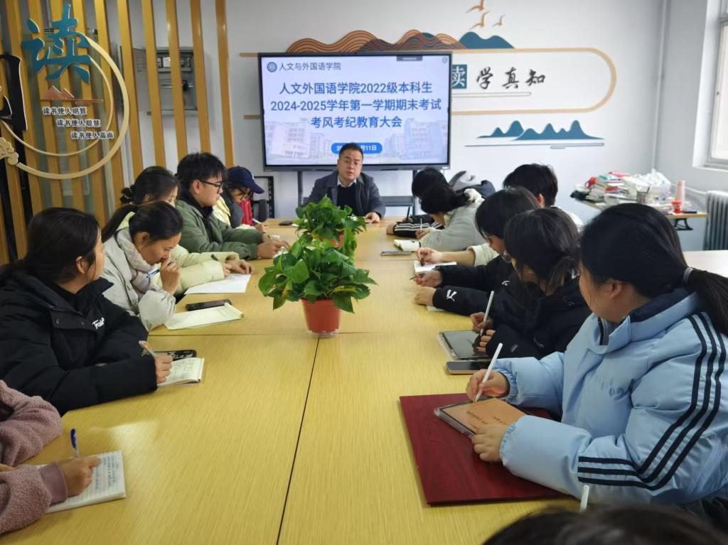 为严肃考风考纪,营造风清气正的考试环境,培养学生的诚信意识和道德品质,12月11日,beat365官方网站于“一站式”学生社区开展2022级本科生大学英语四六级考试、2024-2025学年第一学期期末考试考风考纪教育大会,2022级各班班长和团支书参加了会议,2022级辅导员芮智刚主持会议。