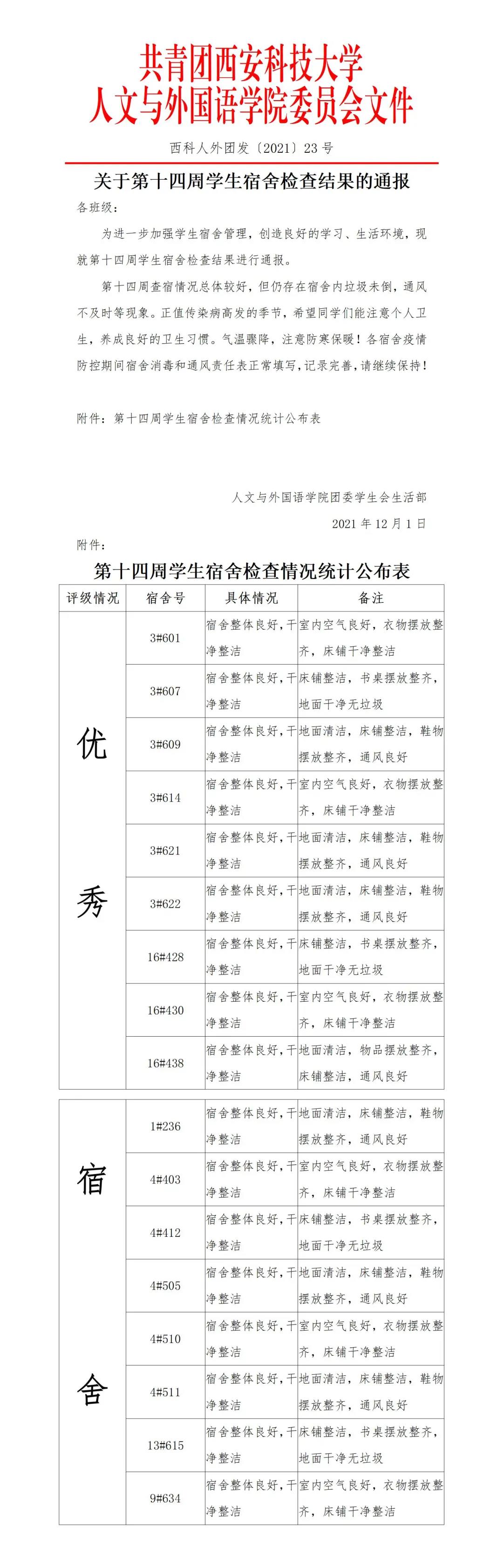 充实的校园生活当然离不开宿舍卫生这一环,通过卫生检查为契机,齐心协力把宿舍卫生环境工作提高到一个新水平,使宿舍达到“亮、净、美”的效果,确保学生在学校健健康康生活而奠定坚实的基础。本次宿舍卫生检查汇总如下: