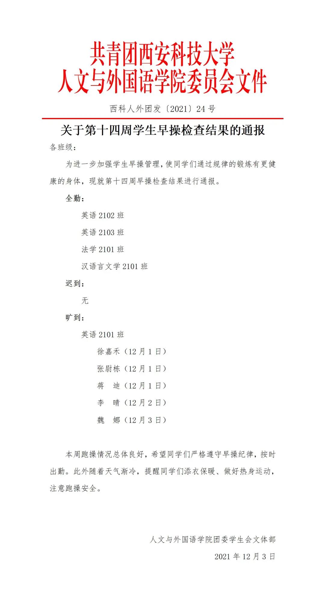 为提高学生的健身锻炼意识和健康水平,学院相关部门进行督导,现将情况通报如下: