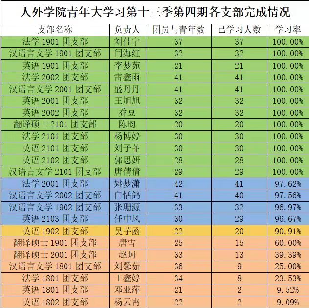 在本次青年大学习中,法学1901团支部、汉语言文学1901团支部、英语1901团支部、法学2002团支部、汉语言文学2001团支部、英语2001团支部、英语2002团支部、翻译硕士2101团支部、法学2101团支部、英语2101团支部、英语2102团支部、汉语言2101团支部完成率达到100%,5个团支部完成率在90%以上,但仍有6个团支部完成率在80%以下,在此希望完成率高的团支部能够再接再厉,而完成率欠佳的团支部,团支书能够积极督促本支部同学进行学习,在新的一学期继续带领大家共同学习新思想,争做新青年,了解党百年奋斗的重大成就和历史意义。
