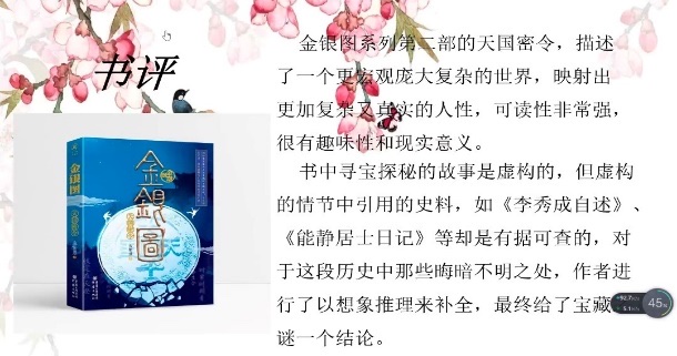 什么是时间轨迹,使用此创作手法写出的故事,又有什么不一样?与会12组同学在阅读《金银图·崇祯宝藏》、《金银图·天国密令》两本书之后做出了回答。各组分别对两本书的情节及艺术手法加以解读赏析,详细介绍了“刘亦然、陈蕾、赵劲夫、李小军”等主人公的寻宝历程。