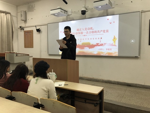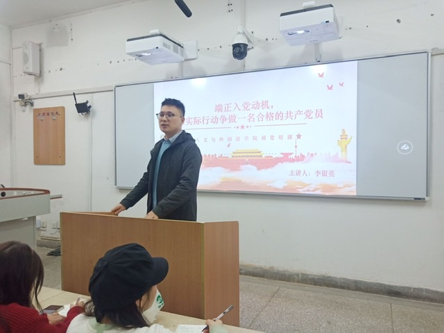 李银亮首先向学员们提问“为什么加入中国共产党”,并由兰信一同学为大家朗读南京航空航天大学马克思主义学院党委书记徐川的文章《我为什么加入中国共产党》,以此启发学员,深化思想,激发学员们的责任感和使命感。李银亮又对“入党动机”进行更进一步的阐释,他指出,入党动机是一个人要求入党的内在原因和真实目的,是推动其争取入党的精神力量,正确的入党动机可以激励自我,也是党员正确世界观、人生观、价值观的反映。