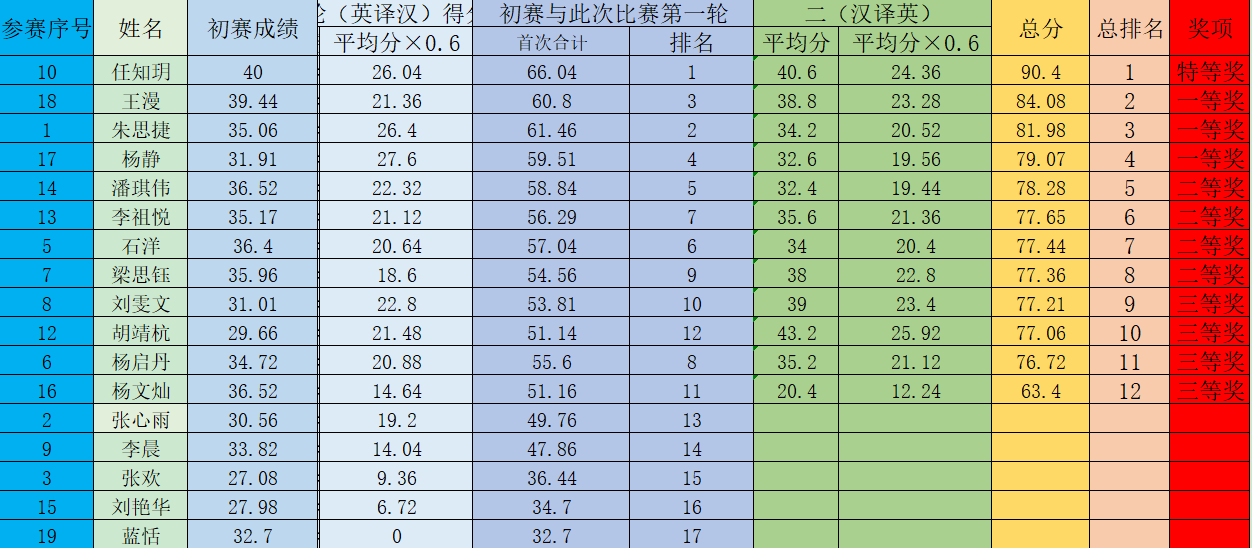 大赛过程中,17名选手凭借扎实的技能基础和过硬的专业素质,充分展示了口译学习的功底及丰富的知识储备。经过激烈角逐,20级翻译硕士任知玥获得本次比赛特等奖,英语1802班王漫、20级翻译硕士朱思捷和英语1801班杨静分获一等奖,20级翻译硕士潘琪伟、英语1802班李祖悦、石洋、英语1801班梁思钰分获二等奖,英语1801班刘雯文、胡靖杭、杨启丹、杨文灿分获三等奖。