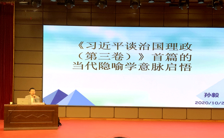 10月20日下午,beat365官方网站举办了“《习近平谈治国理政》第三卷首篇的隐喻意脉启悟”专题学术讲座,广东外语外贸大学“云山杰出学者”、博士生导师孙毅教授应邀担任,梳理了当代隐喻学的发展脉络,并以《习近平谈治国理政》第三卷首篇为研究对象,探析了隐喻在政治话语中的关键作用。在问答环节,孙教授就隐喻分类、隐转喻界定等专业问题进行了耐心解答,并对论文选题、博士备考等实际问题提供了宝贵建议。