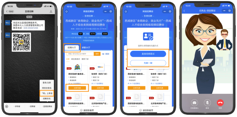 毕业生参会:参会当天进入【显摆招聘】公众号,点击右下角【显摆招聘会】→【码上参会】→识别二维码即可进入【招聘大厅】与企业HR在线聊天,发起视频面试。也可通过电脑端登录https://www.xbjob.com参会。视频面试统一在移动端进行。