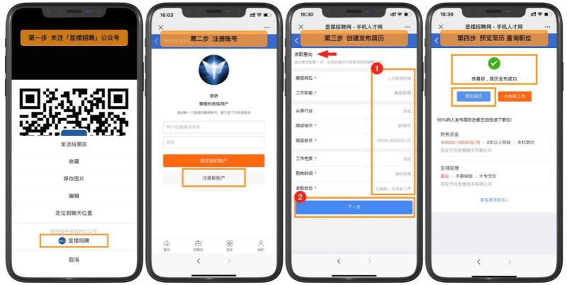 移动端:微信识别上方二维码关注进入公众号,点击右下角【显摆招聘会】→【登录/注册】→点击微信图标→注册新账户→完成账号注册→选择【我是求职者】→完善个人简历→发布简历。