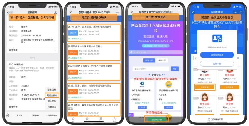 企业报名:进入【显摆招聘】公众号,点击右下角【显摆招聘会】→【网招会报名】→选择参会场次→点击【企业参会报名】→等待审核→审核通过即可在招聘大厅显示。