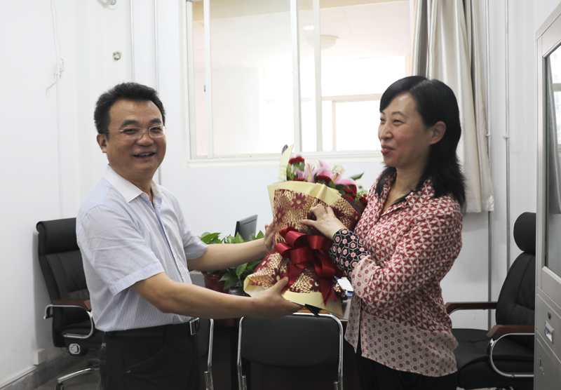 在高宝萍教授的工作室,樊建武代表学校向其送上鲜花和节日问候,详细了解了高老师教学、科研及家庭生活方面的情况,并通过高老师对全体教师教书育人和为学校发展作出的贡献表示诚挚谢意,同时希望大家继续保持良好的工作状态,立足岗位、再接再厉,为提高学校教育教学和人才培养质量、为学校“双一流”建设作出新的更大贡献。高宝萍衷心感谢学校的关怀和支持,表示将继续以严谨的学术态度、求真的科学精神全身心地投入工作,为学校建设发展贡献自己的力量,并祝愿学校未来发展得更加美好。