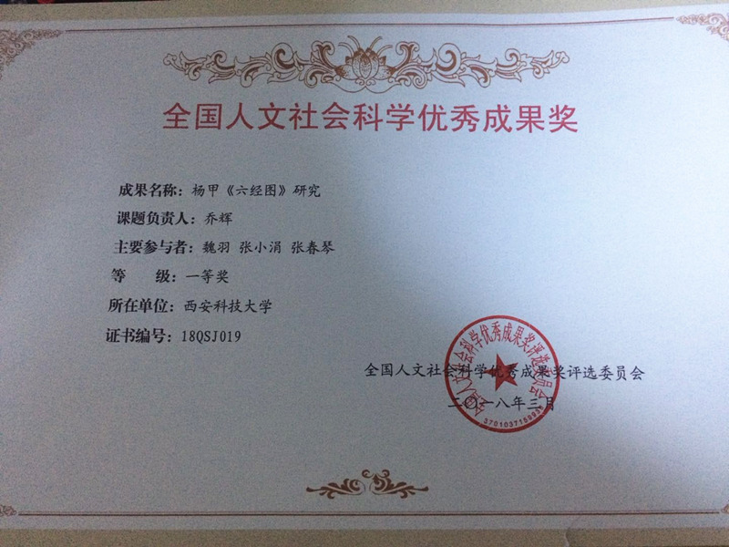 日前,经全国人文社会科学优秀成果奖评选委员会评定,beat365官方网站教师乔辉、魏雨、张小娟、张春琴的研究成果“杨甲《六经图》研究”荣获全国人文社会科学优秀成果一等奖。