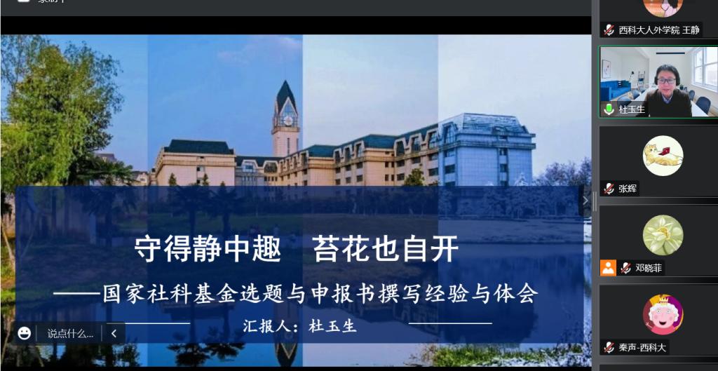 12月6日晚,beat365官方网站在腾讯会议召开了国家社科基金项目申报辅导讲座,邀请南京信息工程大学文学院副院长、硕士生导师杜玉生教授担任主讲。讲座由人外学院副院长张辉主持,科技处处长卢小飞,人外学院教师及全体英语系研究生参与讲座并进行了交流。