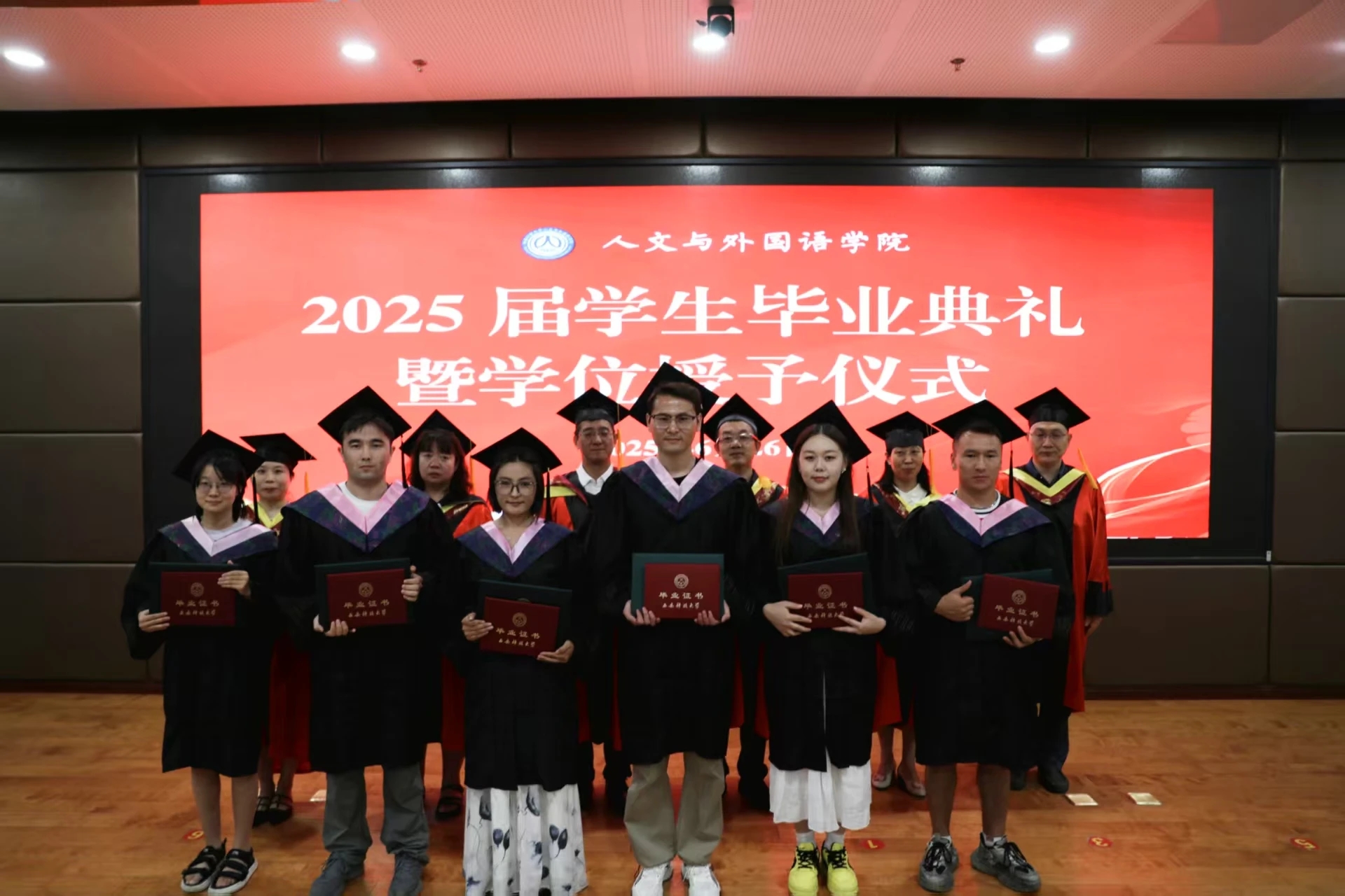 在随后的学位授予仪式上,全体毕业生依次登台。学院领导、学术委员会委员代表为毕业生一一颁发毕业证和学位证、正冠拨穗并合影留念。