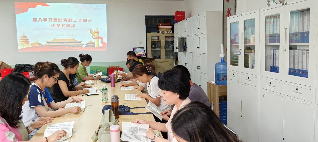 9月10日下午,大学英语教学一部党支部在骊山校园2教313办公室召开全体党员大会,深入学习贯彻党的二十届三中全会精神。支部书记张剑锋主持会议,大英一部全体教师,支部全体党员参加学习。