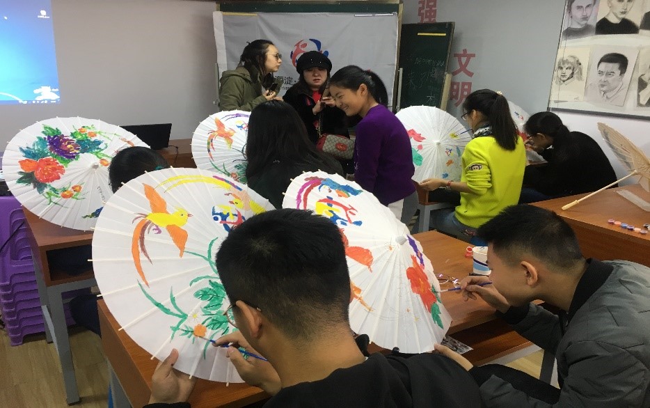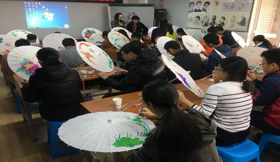 各位志愿者同学摩拳擦掌,开始对手中的油纸伞进行补色,于是没有生命力的不起眼的白伞渐渐亮丽了起来。看着手中的伞一点点变得五彩缤纷,同学们的心也仿佛被点亮了。