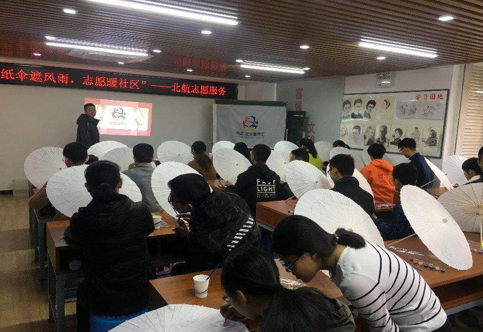 2018年11月24日上午,北航中法第一次志愿活动在新纪元家园社区举行。大一大二的各位志愿者同学们齐聚社区,为空巢老人绘制爱心油纸伞,在深秋的寒风中,为社区的孤寡老人们送来了来自北航中法的一片温暖。