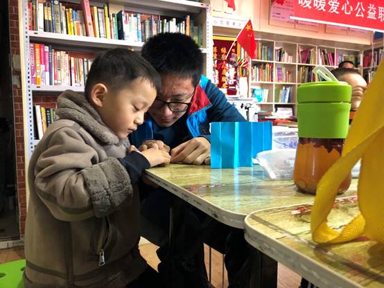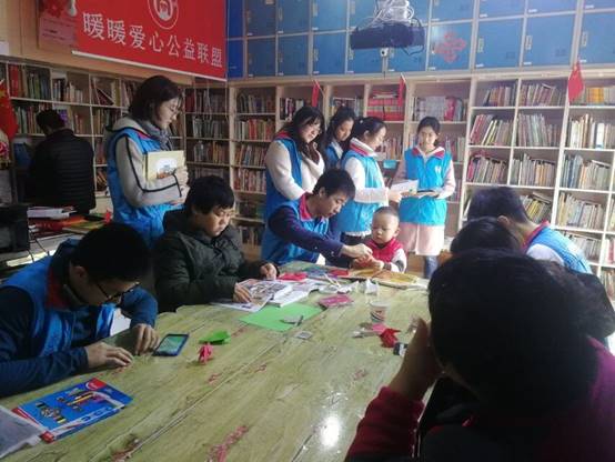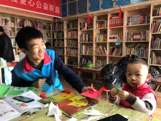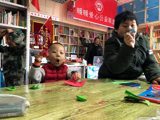 (志愿者在准备上午的折纸活动,有的小朋友在耐心的等待,有的跃跃欲试跟着志愿者折了起来)