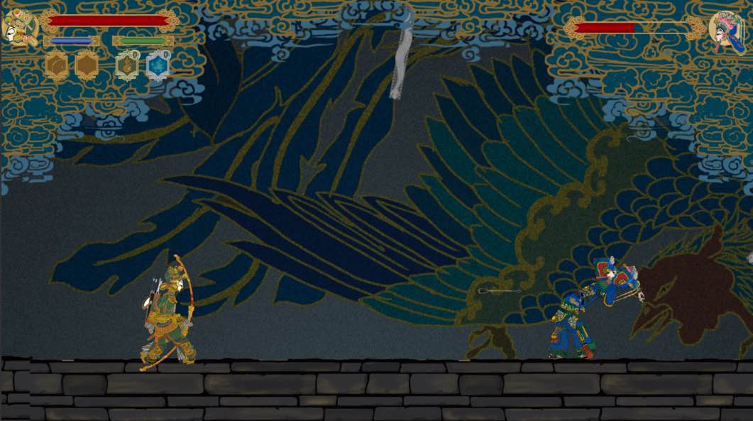 项目顺利启动之后,他们确立了想做动作类冒险游戏的大方向,随后张笑颜提出了一个非常好的想法,将皮影作为主要的中国风元素做进游戏里。目前市场上还没有任何一款皮影风动作类冒险游戏,这意味着他们没有能够完全模仿的对象,所有的游戏设计、美工设计都得靠他们自己去构思。虽然存在着种种未知与困难,但这些未知也激发了他们对最终游戏成品的期待与工作的热情,所以整个游戏的世界观搭建、剧情设计、玩法设计、场景设计以及对游戏市场的分析、目标客户的确定得以在一次次的开会讨论以及在老师的指导下顺利进行。
