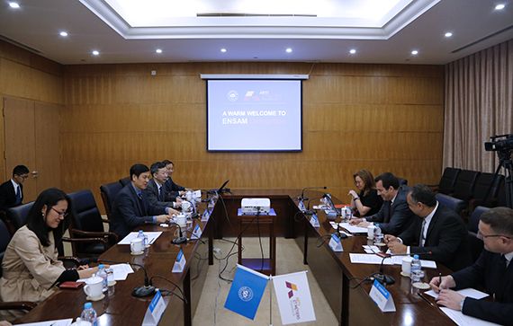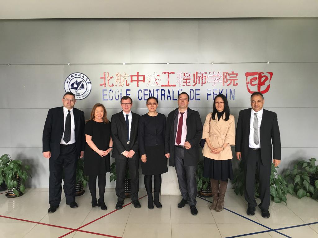 北航新闻网4月5日电(通讯员 童骏/文 记者 孔祥明/摄影)4月5日上午,法国国立高等工程技术学院(ENSAM)新任校长商巴内(Laurent Champaney)教授、国际战略部主任斯图尔特(Audrey Stewart)女士、中国科研顾问西阿达(Ali Siadat)教授、驻华代表裴逸风(Yvon Velot)先生一行访问北航。校长徐惠彬院士在新主楼会议中心会见来宾,国际处、国际学院、材料学院、机械学院相关负责人及教授参加了会谈。
