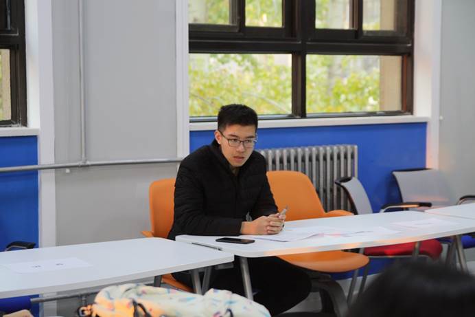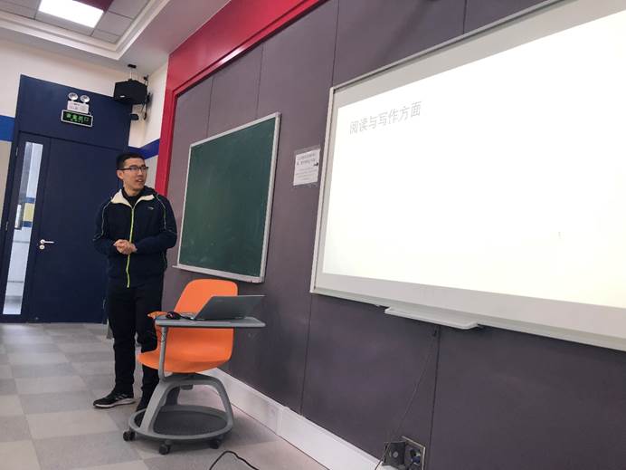会议首先由辅导员蒲啸宇对班级考试整体情况进行汇报。他针对阅读写作、口语和听力三科进行了详细的成绩分析,并结合班级平均分和名次对每个班提出了不同要求,肯定了在期中考试中获得优异成绩的同学,也鼓励了成绩不尽人意的同学。