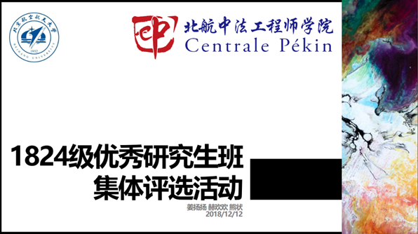 小组评选以答辩的形式进行,于2018年12月12日上午9时30分永利官网所在的第一分组答辩会准时在新主楼A849开始。本次答辩准备材料包括:班级工作经验及先进事迹的整理文稿,班级在北航新闻网和学院网站等媒体上关于班集体建设方面新闻稿的发表情况,以及答辩的PPT。答辩由熊状、姜扬扬、赫欢欢三位同学代表18241班集体进行。他们从班级基本情况、班级党团建设、班级活动以及总结展望这四个方面,条理清晰地展示了18241班级的国际化、企业化特色,和团结、奋进、自强的良好班级氛围。