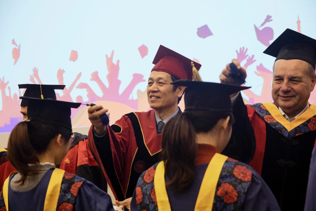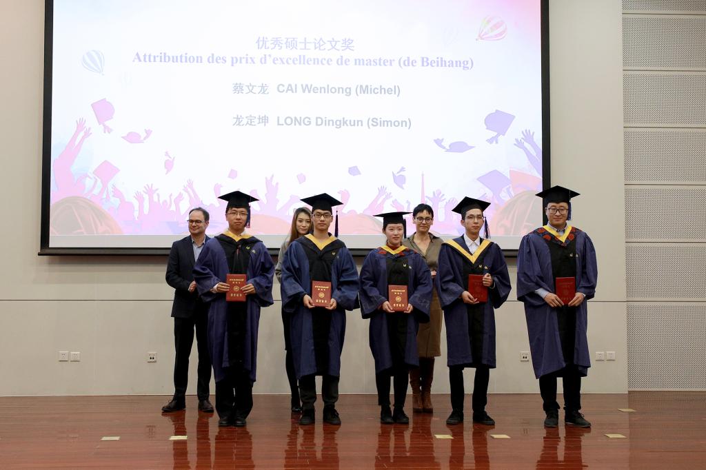 张巍宣布毕业典礼正式开始,所有人员起立,奏唱国歌。随后,永利yl23411官网分党委书记兼院长洪冠新教授宣读了2019届硕士学位授予名单,法方院长Frédéric GENTY教授宣读了2019届法国通用工程师学位授予名单。徐惠彬院士、黄海军教授、Romain SOUBEYRAN教授、Gérard CREUZET院士等为毕业生拨穗并颁发学位。典礼还对北京市优秀毕业生获得者、校优秀硕士论文获得者、“中国商飞-斯伦贝谢”优秀实习奖获得者进行了表彰。