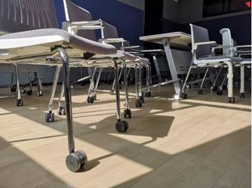 现在的桌椅又加上了静音轮,有的教室每个人都有独立的桌子和椅子可以移动。再也不用担心上课坐后面需要晃头晃脑的插缝看黑板了!