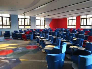 蓝红交错——沙发质感,舒适学习。309教室的座椅将红色的热烈与蓝色的冷静相结合,这样的视觉冲击给人带来眼前一亮的惊喜感。座椅圆形的设计让学习更加舒适,采用的沙发质感更是让人身心放松。圆形座椅自带的桌子大小适中,方便书写,还带有支架,可以放置手机或平板电脑,让这些设备更加方便的帮助我们记录笔记、体会重点。当然,桌旁的水杯支架、椅子下的书包放置处也为我们的高效课堂提供了保障,帮助我们更好地学习。