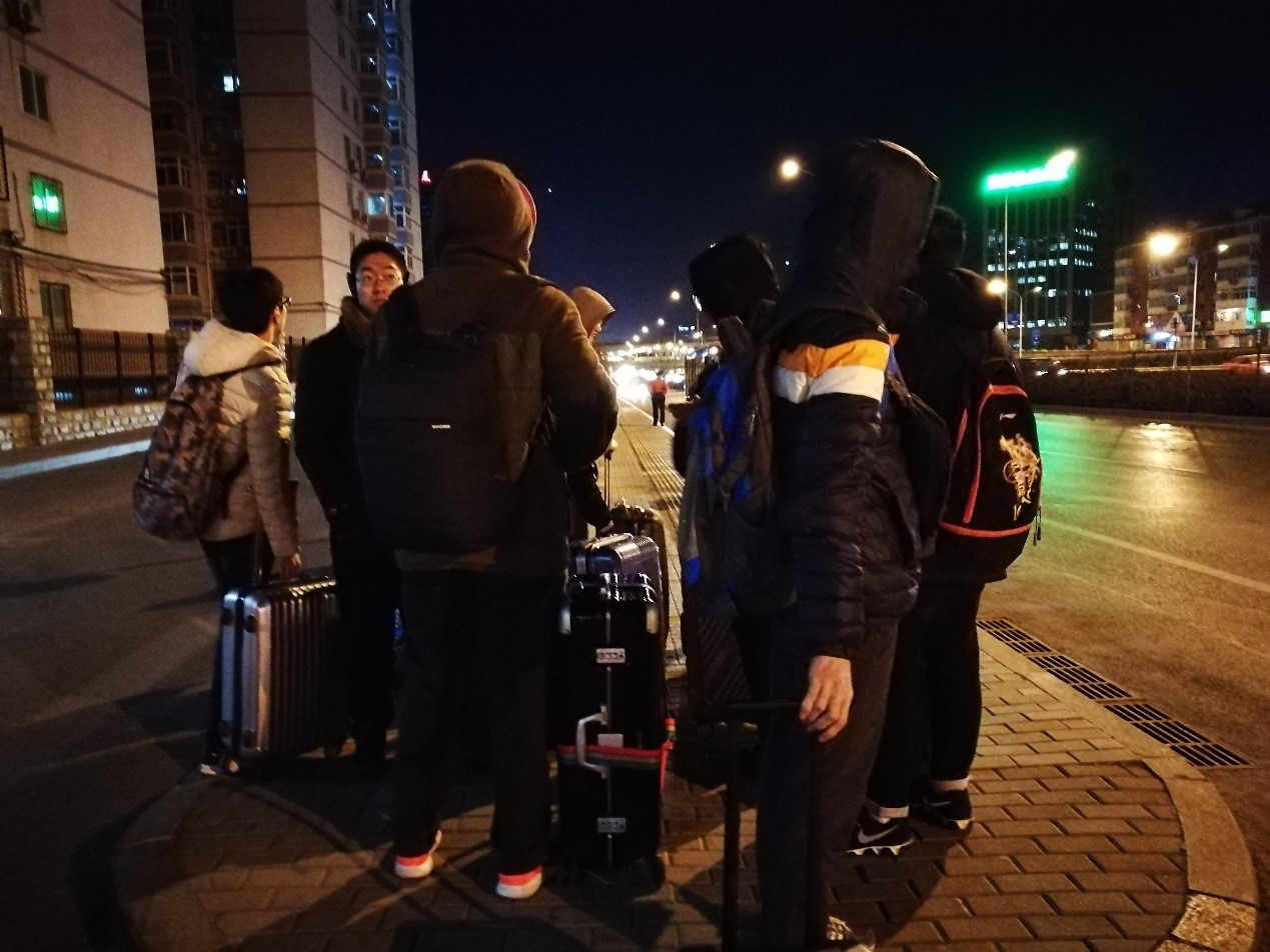| 图 1 北京时间2017年2月4日晚学生们在北航北门等待机场大巴 |