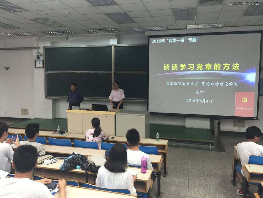 最后,高老师明确了第三个要求——史论结合。他强调党章只讲“是什么”,不讲“为什么”,结合相关史实,才能更深入地学习理解党章党规。高老师还为大家推荐了《党章学习问答》《中国共产党历次党章汇编》《中国共产党历史》等书籍,此次党课,同学们都受益匪浅。让各位党员对党章党规有了更全面、更清晰、更深刻的理解。希望所有学生党员都能以此为契机,深刻理解“两学一做”的重要意义并在课下自觉学习党章以及习近平总书记系列重要讲话,努力提高自身的党性修养,切实加强自身的政治敏感性,做一个合格的中国共产党党员。