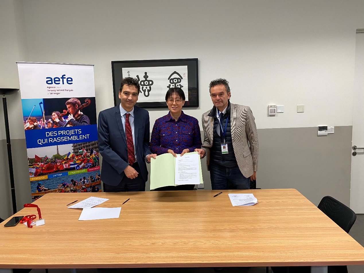 2019年11月29日,学院中方院长洪冠新、法方院长GENTY一行访问坐落于北京顺义区的北京法国戴高乐国际学校,并与校长Villegas共同签署合作备忘录。未来双方拟在教师和学生交流方面开展合作,并在数学教学、工业科学教学方面展开全方面的合作。