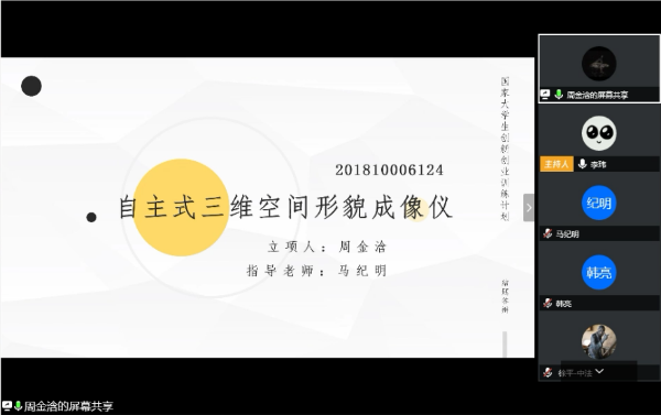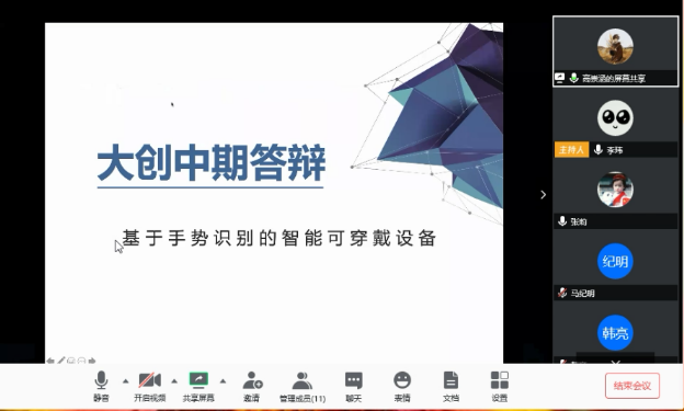 2020年4月22日中午12时30分,永利yl23411官网第十三届国家大学生创新创业训练计划中期检查评审会通过腾讯会议平台正式开始,本次评审会由永利yl23411官网徐平、李牧、殷传涛、马纪明、韩亮、张莉等六位老师担任专家组评委,检查了《手势控制智能可穿戴设备》等4个项目的中期进度。同时,专家组还评审了《自主式三维空间形貌成像仪》等2个延期结题项目。