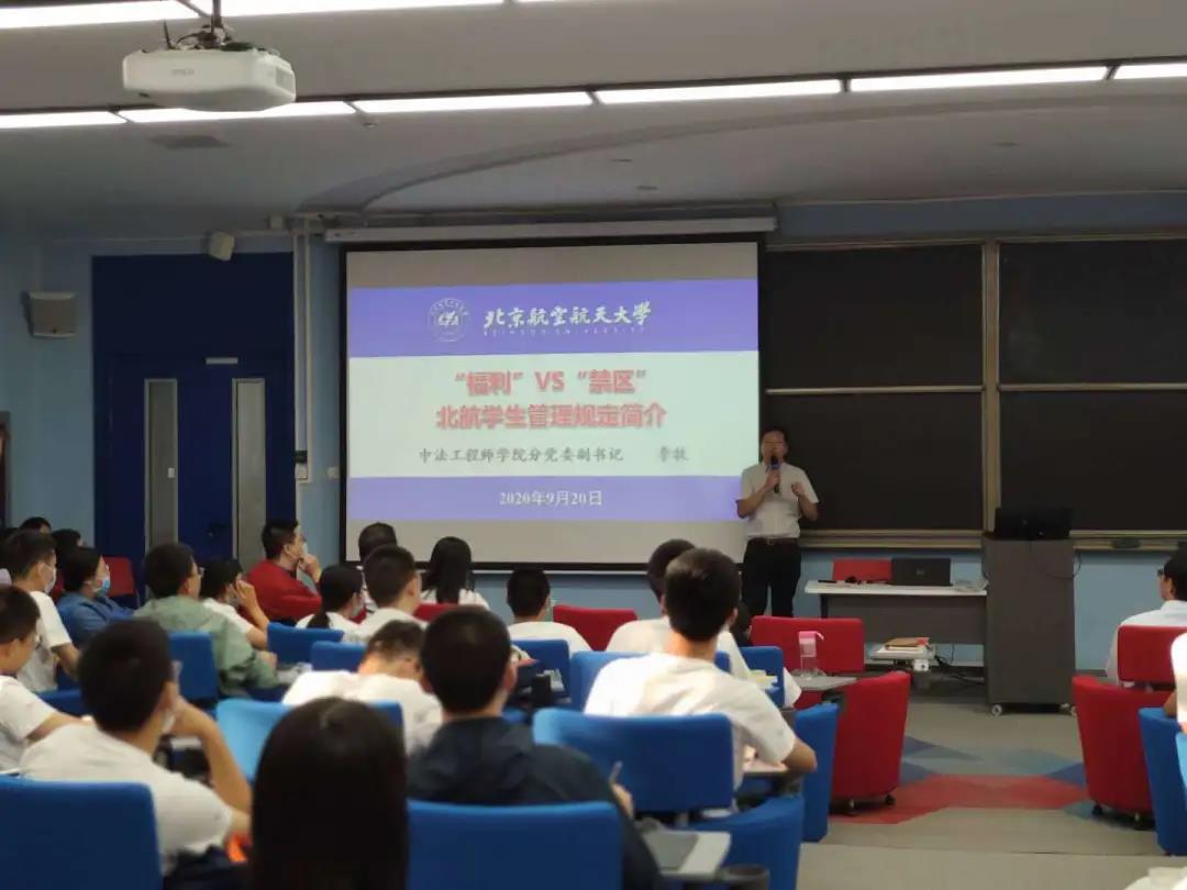 最后,学院党委副书记李牧老师为同学们解读了北航学生管理规定,从奖助体系、推免研究生和深造情况等方面介绍了北航学生的“福利”,并从退学、处分条件及案例提醒同学们规避“禁区”。