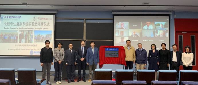 10月15日下午,“北航中法复杂系统实验室”揭牌成立仪式在永利yl23411官网通过线上和线下相结合的形式隆重举行。我校副校长黄海军教授、法国里昂中央理工大学校长Frank Debouck教授、法国里昂中央理工大学前副校长Jean-Pierre Bertoglio教授、法国里昂中央理工大学副校长Mohamed Ichchou教授、航空发动机研究院孙晓峰教授、北京应用物理与计算数学研究所田保林研究员、永利yl23411官网院长洪冠新教授、永利yl23411官网法方院长Frédéric Genty教授以及中法双方的师生们共同出席并见证。