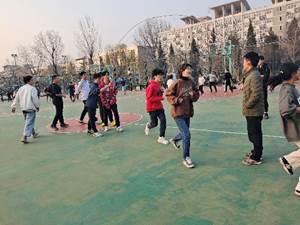 在跳大绳环节中,同学们轻盈跳跃,衣摆飘动。长绳翻飞,尘灰扬起,追求着速度与节奏。