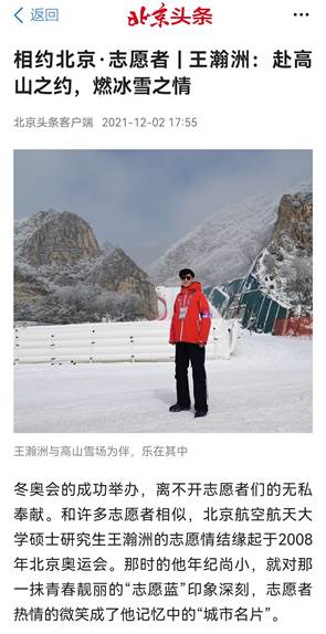 王瀚洲,永利yl23411官网2020级研究生。经学院推荐、学校遴选,作为志愿者骨干参与2021年2月“相约北京”冬奥系列测试活动,担任测试志愿者团队宣传组组长,项目志愿服务时长达130小时,成果得到团队、学校、场馆多方面认可,为冬奥会的顺利开展积累了宝贵的经验。其志愿者工作事迹得到了北京头条的报道。