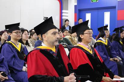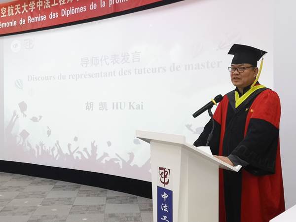 硕士生导师代表胡凯教授在发言中首先表达了对参加毕业典礼以及对所指导学生朱健取得优异成绩的喜悦。祝贺毕业生收获了毕业证书、学问、也许还有人生伴侣,以及最重要的成长。胡凯老师表示他已带过多届中法学生,他夸赞中法的同学们十分优秀,他鼓励大家作为优秀的人遇到了伟大的时代,需要做的就是激情与创造,创造属于自己的神话和未来。最后寄语同学们独立、勇敢和坚持,坚持所有要坚持的理想、初心、价值、信念,直到永远。
