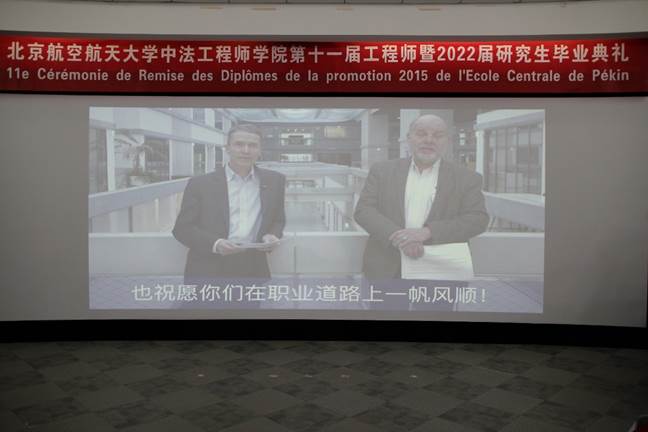 画面切到主会场,齐唱国歌后,毕业典礼正式开始。校长徐惠彬院士送上祝福“中国的答卷很辉煌”、“北航的答卷很精彩”、“你们的答卷很亮眼”,勉励毕业生让自己的未来成就卓越。学院分会场中央理工集团Romain SOUBEYRAN主席和Gérard CREUZET教授因疫情影响未能来华,特此发来视频表达对中法毕业生的祝贺。SOUBEYRAN主席肯定了北航和中法的毕业生培养质量,告诫毕业生进入职场后持续更新知识储备,不能在取得一些成就后就故步自封,要学会不断反思。CREUZET教授强调各位毕业生不仅是北航校友,也是中央理工集团校友大家庭一员,可以在各行各业互帮互助。最后SOUBEYRAN主席特别感谢了北航对永利yl23411官网建设的大力支持。