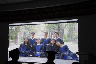 暖场视频前半段用毕业生从2015年本科入学至2022年硕士毕业的回忆串联,后半段则是学院中法方老师们对同学们的祝福寄语,现场师生深有感触,营造了温馨的毕业氛围。