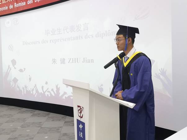 毕业生代表朱健发言,回顾了在中法六年半的课程、生活、科研、实习等方面,展望未来作为国际通用工程师为国分忧、为国解难、为国尽责,最后感谢中央理工集团、学校、学院、老师及同学们多年的培养和陪伴,祝福永利yl23411官网明天会更好。
