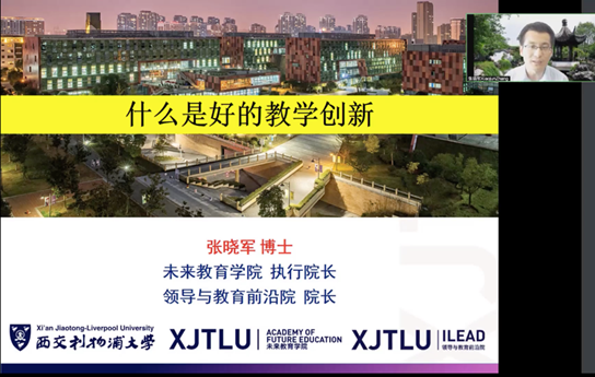 特邀嘉宾西交利物浦大学未来教育学院执行院长张晓军主讲“什么是好的教学创新”。张晓军院长从教学创新的点、线、面、体和钻石模型出发,解读了西浦大赛的理念是倡导和鼓励“以教师为中心”向“以学生为中心”体系转变的教学创新,并提出面向未来的十个教学创新新方向。