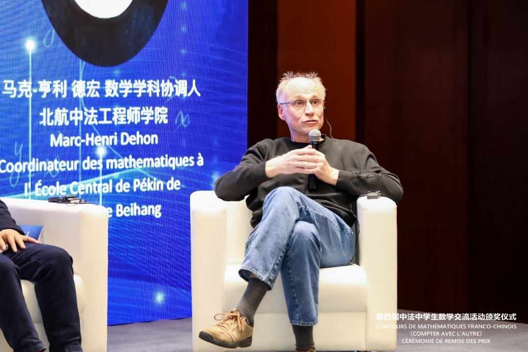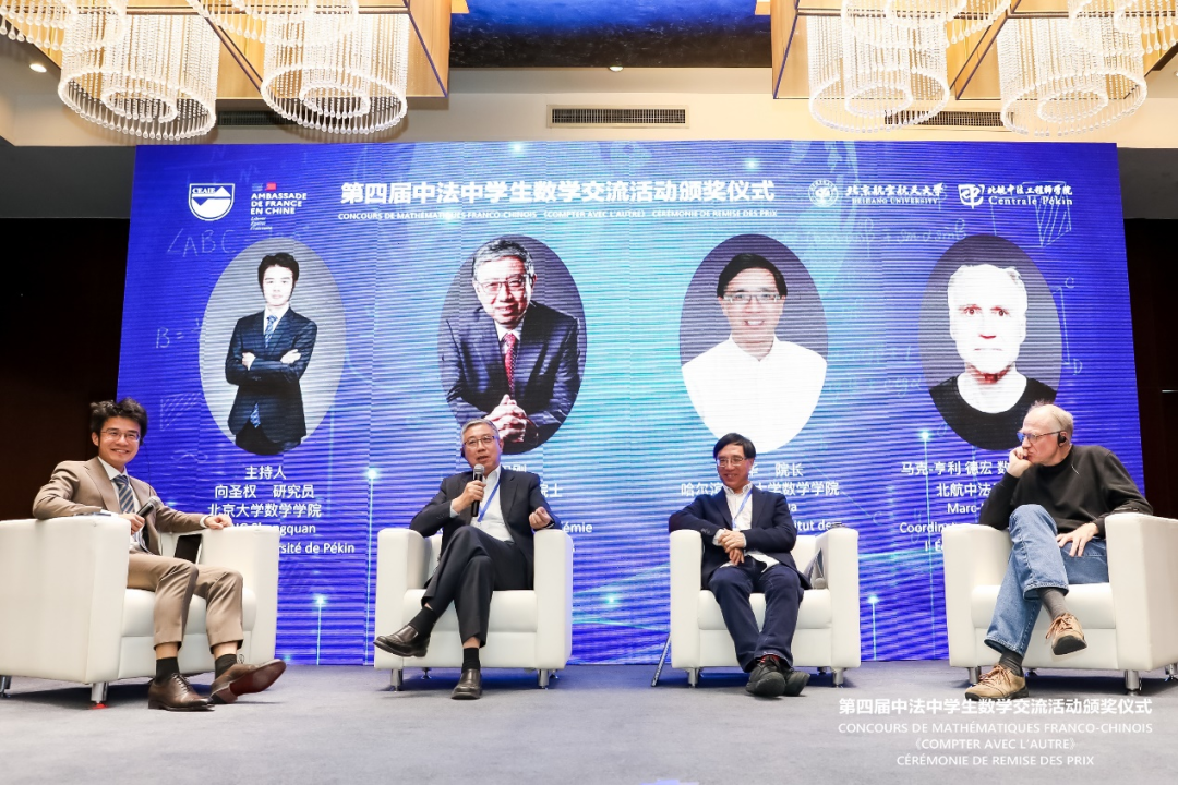 此外本次颁奖仪式增设了大师与学生面对面交流环节,邀请到法国数学家让-皮埃尔·布吉尼翁(Jean-Pierre BOURGUIGNON),中国科学院院士田刚教授,哈尔滨工业大学数学研究院院长许全华教授以及北航永利yl23411官网法方数学协调人马克-亨利 德宏(Marc-Henri DEHON),他们分别到场的获奖师生就中法两国的数学文化、数学教学以及当前人工智能等热点问题进行了热烈的讨论与交流,共同呈现了一场精彩纷呈的数学交流盛宴。现场气氛热烈,师生纷纷表示收获匪浅,活动结束后久久不愿离场。