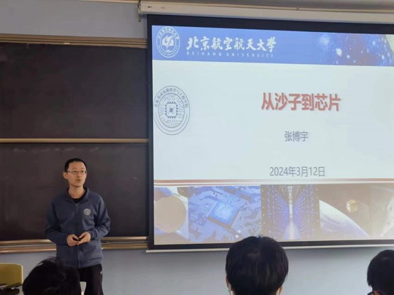 作为中法学院优秀校友代表,张博宇老师结合科普视频以幽默风趣的方式为同学们带来了一场有关芯片制备的科普讲解,形象的展示了如何将普通的沙粒转变为集成电路中不可或缺的芯片。他向大家详细介绍了磁存储制备与调控、新型低功耗器件、超快光电信息写入等研究方向,欢迎同学们参与到集成电路的研究当中。