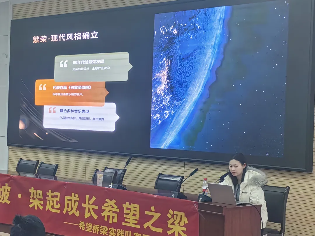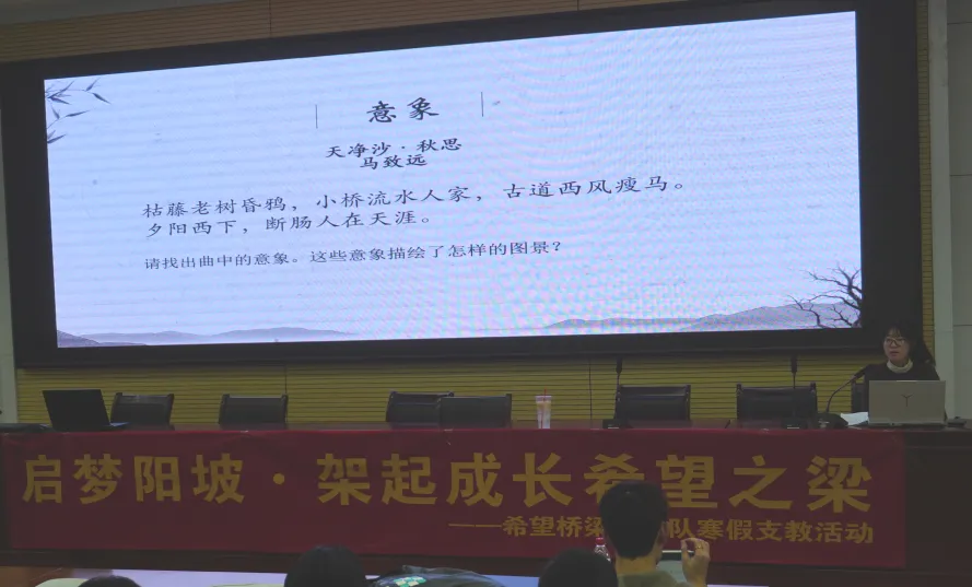 我主讲“法语入门”和“诗词”两门课。“法语入门”分字母表、日常用语、法语语音三个部分,我们从最基础的部分讲起,激发同学们对语言学习的兴趣。而在“诗词”课上,我从“意象”“意境”入手,讲解了诗词中的修辞手法和表现手法。在教学的过程中,我发现,大部分同学的文学素养相较于发达地区的同龄人是不足的,而部分孩子们对于诗词的兴趣也并不高,因此这一方面还有待加强。